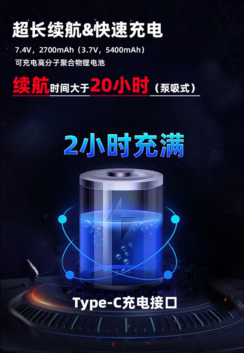 電池容量 | 7.4V,2700mAh(3.7V,5400mAh)可充電高分子聚合物鋰電池,續航時間大於20小時(泵吸式) |