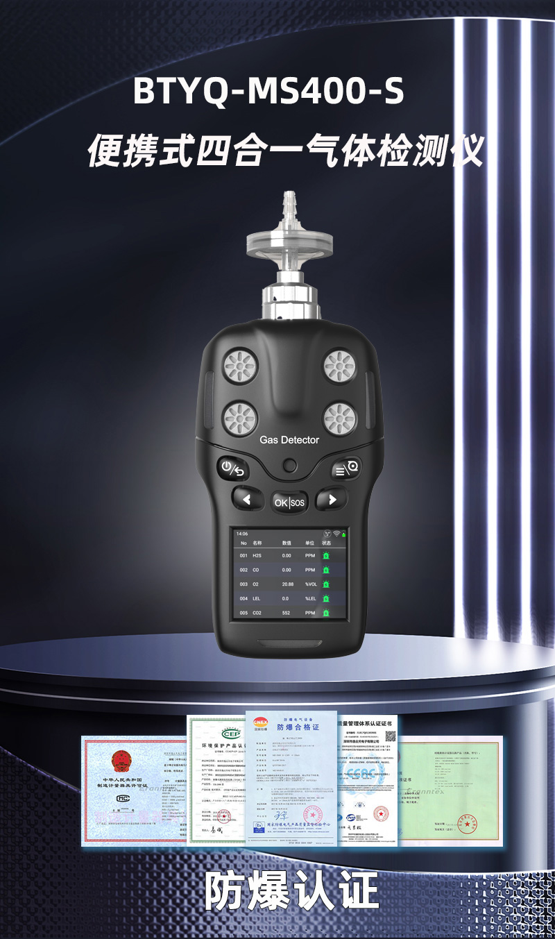 BTYQ-MS400-S便攜式四合一黄瓜视频在线观看儀主要用於快速準確檢測氣體泄露或氣體濃度超標報警,內含1-4個數字傳感器,每個數字傳感器都是即插即用,智能識別。黄瓜视频在线观看的主要檢測原理有:電化學、紅外、催化燃燒、熱導、PID光致電離等。BTYQ-MS400-S廣泛應用於消防、應急救援、受限空間、石油、化工、冶金、煉化、燃氣、倉儲、醫藥、環保、空氣治理等場合。