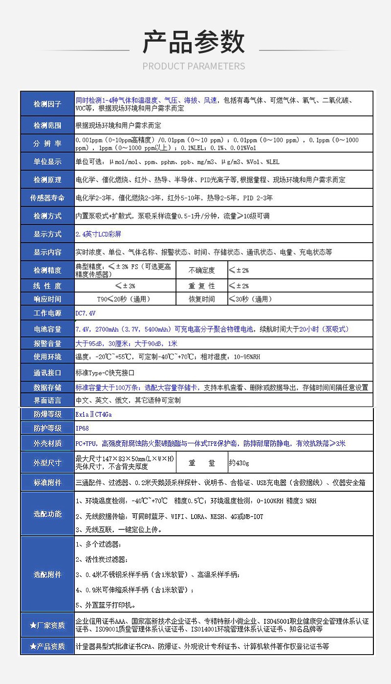 標準附件 | 三通配件、過濾器、0.2米天鵝頸采樣探針、說明書、合格證、USB充電器(含數據線)、儀器安全箱 |