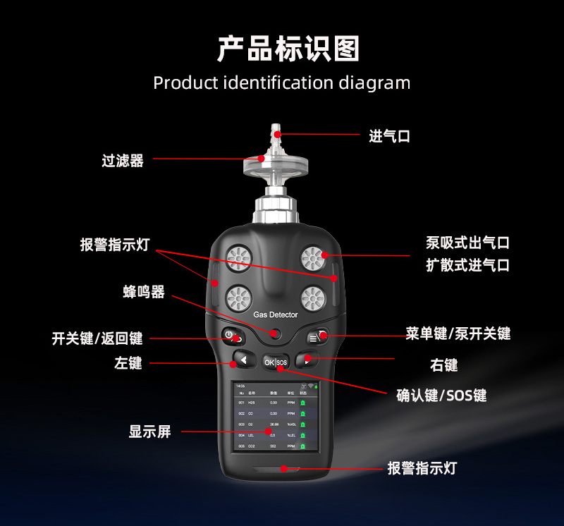 報警種類:濃度報警、欠壓報警、故障報警、泵堵塞報警、跌倒報警、SOS報警(運動報警)。